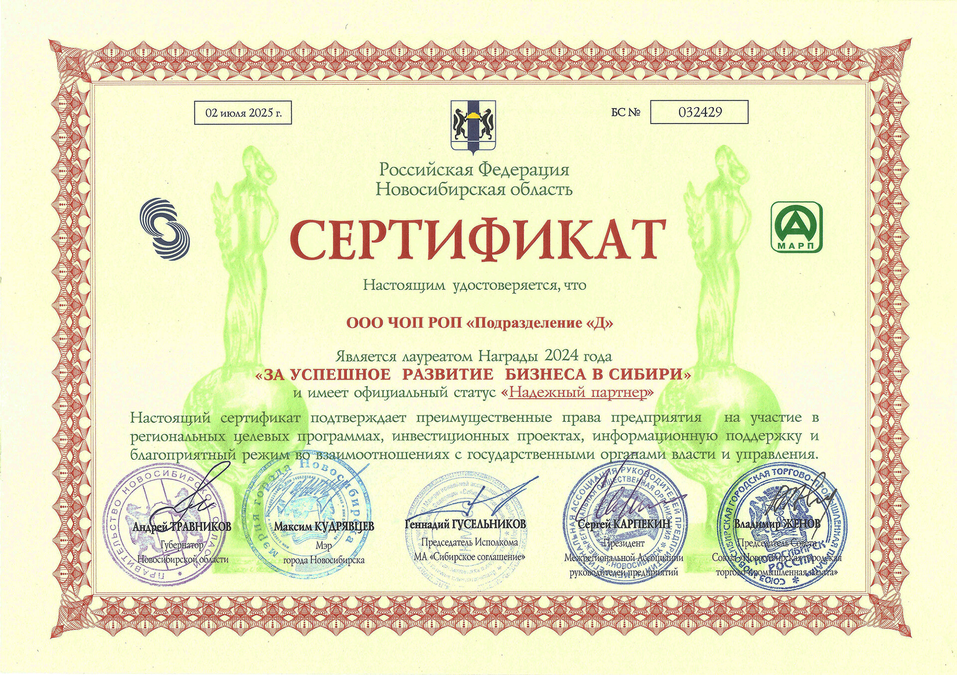 ООО ЧОП РОП "Подразделение "Д" получило сертификат и диплом лауреата награды и имеет заслуженный официальный статус "Надежный партнер"!